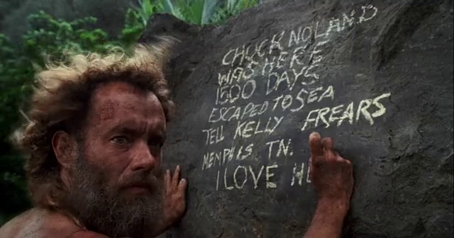 The symbolism, too, is often a bit broad. Wings of angels and blood stained volleyball companions work to varying degrees, and the corporate Fed Ex stamp is ever-present, even on this remote island. More nicely handled are the objects of every day waste or taken-for-granted use that Hanks discovers upon his return. Sure made me appreciate my lighter, that’s for certain.