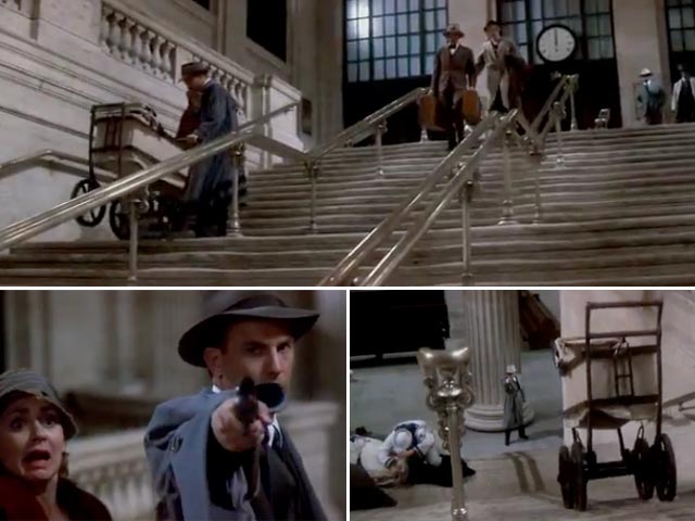 This film comes in at just shy of two hours. If it were made in 1967 it would have been two and a half hours or three. If it had been made in 2007, it would have been 95 minutes. There are scenes which move quickly, like the taking of an alcohol storage space. Then there are scenes which deliberately take their time, like the conflict on the US/Canada border. But the scene on the stairwell, which was shot complete with white suited soldiers and a falling baby carriage, was bordering on directorial masturbation as De Palma was determined to shoot an homage to the famous Russian silent film BATTLESHIP POTEMKIN (the collage above is from this sequence). The scene is marvelous, no doubt, but I wonder if those not in on the homage got as much out of it, or were instead wondering “Why have they shown that baby twenty times?”