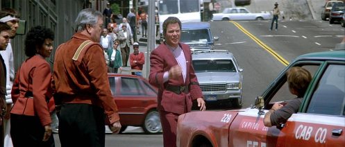 STAR TREK IV doesn’t want to go too far into social issues, despite the save-the-whales stuff. I mean they are in the center of San Francisco during a very liberal time, but the movie is content to deal with its one social theme. Sure, Chekov gets himself in a little Cold-War trouble by trying to steal some nuclear material, but this movie isn’t really about its social themes. That is what makes this such an oddity. They decided to utilize the humpback whales idea as a springboard into a time-travel scenario, yet they never really explore any issues other than to say ‘hunting whales is bad’ and ‘what you kill now may come back to haunt you later’. In that sense, this isn’t a really sophisticated film.