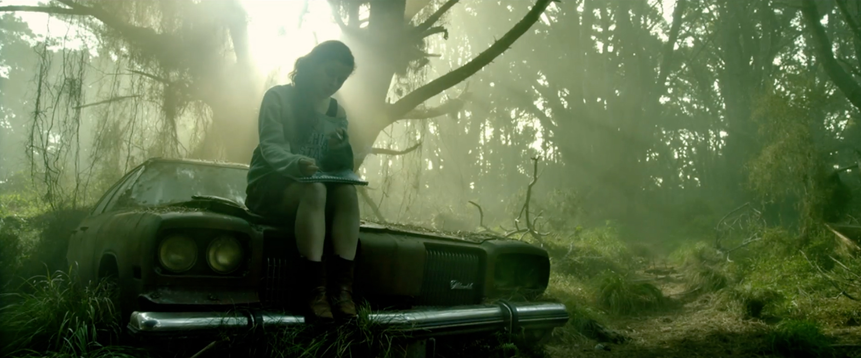 The above image is our introduction to our new heroine Mia (Jane Levy). She sits, literally, atop one of the symbols of our old hero Ash. His Oldsmobile Delta is a relic. It is a thing of the past. Quite to the point, it no longer works. Instead we have this new person, this young woman in a Michigan State shirt (also like the original) ready to bring the EVIL DEAD franchise into the present.