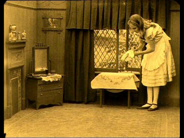 The first shot in the 1915 ALICE IN WONDERLAND is a still set up showing a kitchen. Alice (15 year-old Alice Savoy) and her sister and a woman (assuming her mother) are cooking and walking about. The shot is far too long with little happening. Then, Alice and her sister go outside. Alice sees animals. Alice falls asleep. In a shot with surprising value, her spirit exits her body to follow a rabbit.